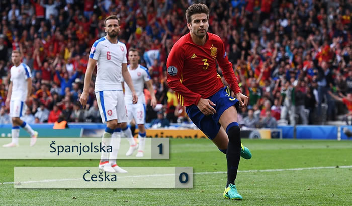 David Silva je pokušao u 73. minuti, ali pored gola, a kad se činilo da će Česi izvući bod, Iniesta je ubacio u šesnaesterac protivnika, gdje je najviši bio Pique i zabio z a1:0.