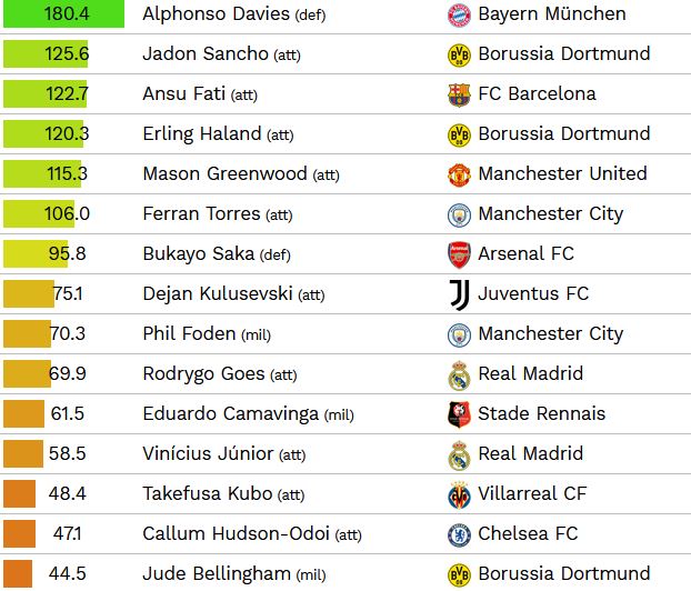 Nogometaš minhenskog Bayerna Alphonso Davies predvodi listu CIES nogometnog instituta koja prikazuje vrijednost igrača rođenih 2000. godine ili kasnije u klubovima pet najjačih europskih liga. Njegova je tržišna vrijednost trenutno na 180 milijuna eura, čime je nadmašio Jadona Sancha iz dortmundske Borussije (125 milijuna eura) i Ansua Fatija iz Barcelone, čija je vrijednost 123 milijuna eura.